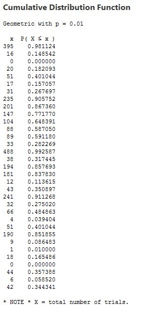 I used Minitab to create a cumulative distribution function for data, using the geometric distribution with probability set at 0.01. This gives us some additional detail about how many incident-free days we're likely to have until the next borewell tragedy strikes: