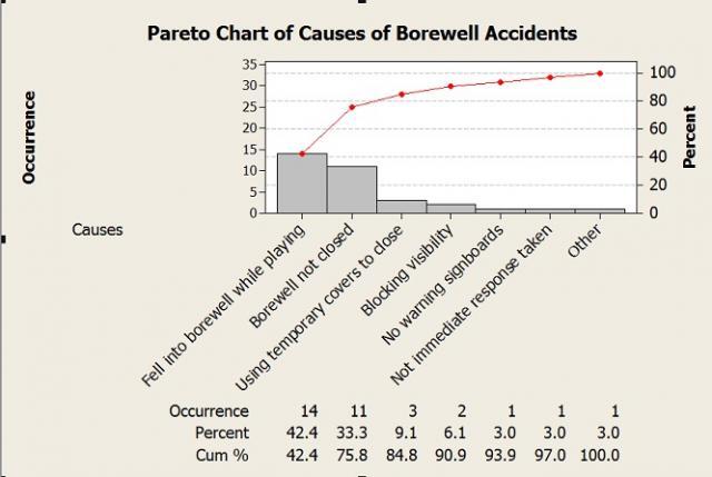 I used a Pareto chart to analyze the various causes of these borewell accidents, which revealed the top causes of these tragedies: