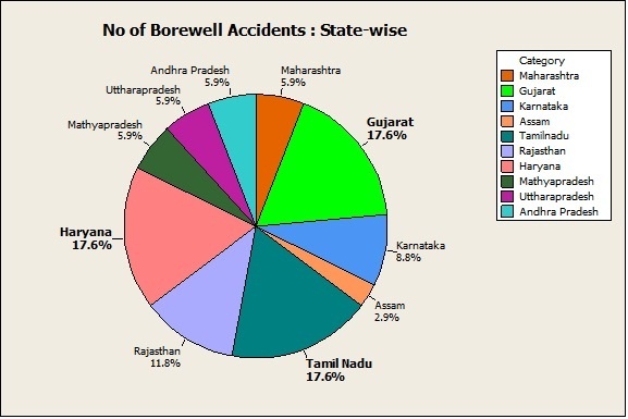 Analysis of a state-wise pie chart, shown below, indicates that Haryana, Gujarat, and Tamil Nadu top the list of the borewell accident states. These three states alone account for more than 50% of the borewell accidents since 2006.