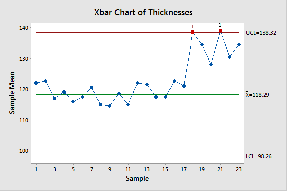Now suppose the process has changed, but with the new re-calculated center line and control limits, the process is still shown to be in control (using the default Test 1: 1 point > 3 standard deviation from the center line).