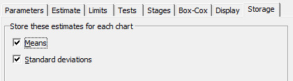 Note: If you want to use the estimates from another data set, such as a similar process, you could obtain the estimates of the mean and standard deviation without solving for s. Choose Stat > Control Charts > Variables Charts for Subgroups > Xbar. Choose Xbar Options, then click the Storage tab. Check Means and Standard deviations. I'll use the data from the first 12 subgroups above for illustration: