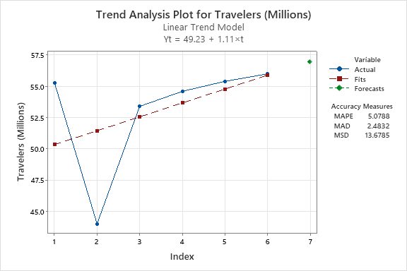 The analysis confirmed that 2020 was indeed an outlier. When we removed it to focus on post-pandemic travel trends, the projection rose to 56 million, reflecting the steady return to pre-pandemic travel levels.