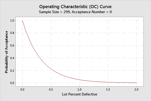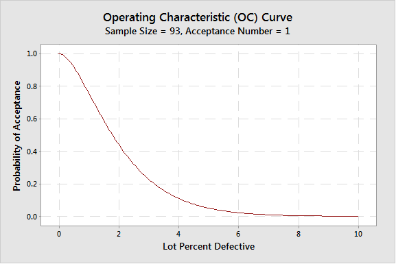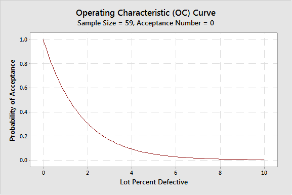 As you can see, the sample size for an acceptance number of 0 is much smaller—in this case, raising the acceptance number from 0 to 1 has raised the sample size from 59 to 93.
