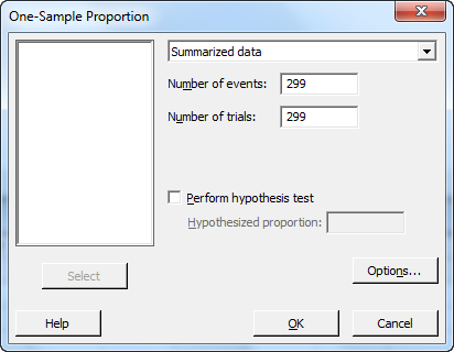Of course, if you don't feel like calculating this manually, you can use the Stat > Basic Statistics > 1 Proportion dialog box in Minitab to see the reliability levels for different sample sizes.