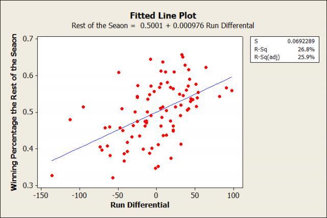 We see that a team’s current winning percentage explains only 24.6% of the variation in the team’s future winning percentage. That’s not very much. If you want to determine how a baseball team is going to perform the rest of the season, you shouldn’t be looking at just their current record. So will the run differential tell us more?