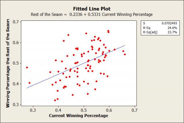 For the last 3 years, I took each baseball team's winning percentage on June 8th. I also recorded their run differential (total runs scores in the season minus total runs allowed) on June 8th. Then I took their winning percentage in games played after June 8th until the end of the regular season. So total, there are 90 observations (30 teams times 3 years). You can get the data here and follow along if you like. We want to see which is correlated more with future winning percentage, a team’s current winning percentage or their run differential. We’ll start by using Minitab to create a Fitted Line Plot for each situation. Here is the plot that uses a team’s current winning percentage.