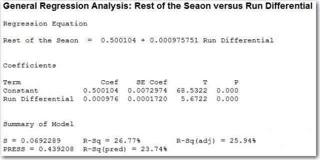 So the question is, should Pirates fans be encouraged that their team has a winning record or concerned that they are being outscored? That is, which stat is a better predictor of future success? Hmmmmm, that sounds like a job for Minitab’s Regression Analysis.