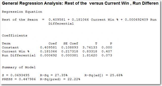 This is a little better, but not by much. Run differential explains 26.8% of the variation in the team’s future winning percentage. So it looks like we can’t simply look at the run differential either. What if we use a regression analysis and put both run differential and current winning percentage in the same model?