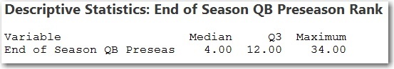 The median value is 3, meaning that half of the top 5 preseason quarterbacks finished in the top 3 at the end of the season. That’s pretty good! The individual value plot confirms this, showing that most of the data points are clustered between a rank after the season between 1 and 4.
