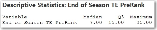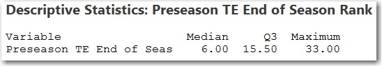 We much higher variation with tight ends than with quarterbacks. The median and Q3 are about two times larger than for quarterbacks. The individual value plot shows that 36% of tight ends finished the season outside the top 10, as opposed to only 24% for quarterbacks. Sometimes this is due to injury, as it was with the 3 names at the top of the plot. But Jermichael Finley (2010) and Brent Celek (2010) both played in every game, yet still ranked outside the top 15 in fantasy scoring despite being highly ranked in the preseason.