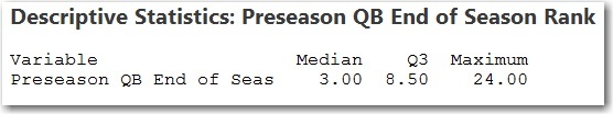 But what if you don’t want to take a quarterback early? Can you wait until a later round and still draft a top 5 quarterback? This next individual value plot and summary stats take the top 5 quarterbacks at the end of the season, and shows where they were ranked before the season started.