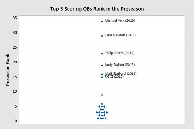Diamonds in the rough are rare for quarterbacks, as half of the quarterbacks ranked in the top 5 at the end of the season were ranked in the top 4 before the season. About 1 quarterback a year is ranked outside the top 10 in the preseason but finishes in the top 5. But some of them, like Vick and Newton, were so far off the radar in the preseason that they weren’t even drafted in most fantasy football leagues.