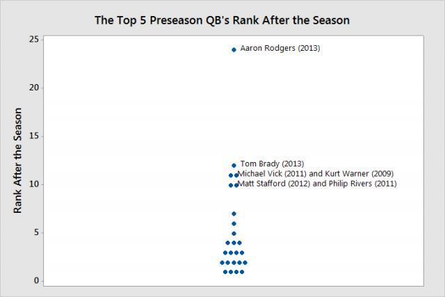 Let’s begin by looking at how the top rated preseason quarterbacks fare by the end of the season. I took the top 5 ranked preseason quarterbacks for each season from 2009-2013 and recorded where they ranked to finish the season. Here is an individual value plot and summary statistics of the results.