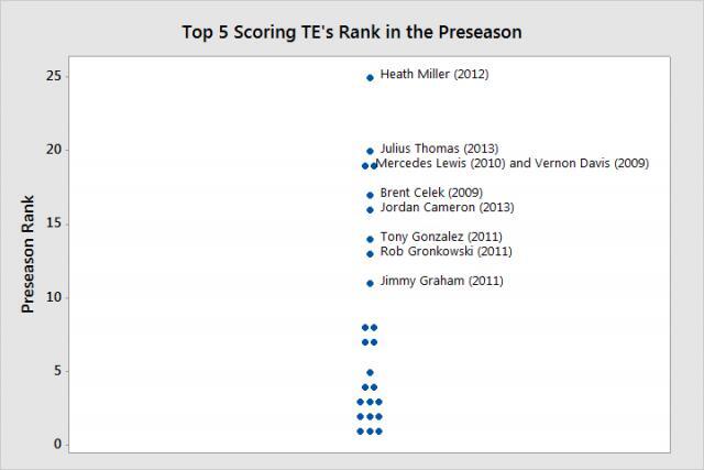 There are 9 different tight ends since 2009 who started the season ranked outside the top 10, but still managed to finish in the top 5. Can you believe Julius Thomas was ranked as the 20th best tight end last year? In hindsight, that seems ridiculous! And in 2011, the top 3 scoring tight ends were all ranked outside the top 10 to start the season!