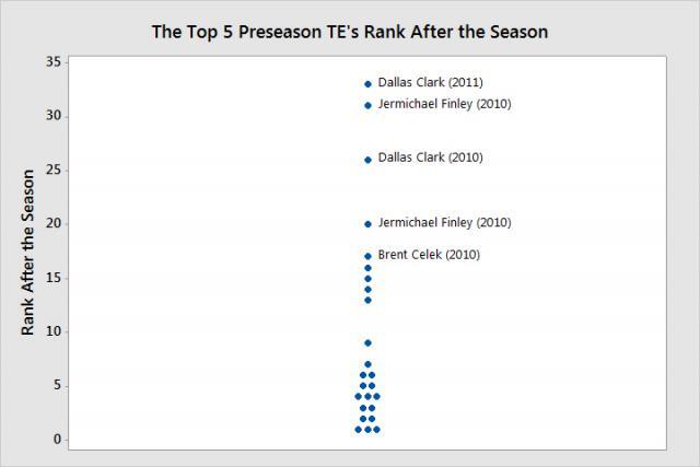 I thought about just writing “Jimmy Graham” and moving on to the next position. But I already collected the data, so I suppose I might as well analyze it. Here's how the top 5 preseason tight ends ranked at the end of the year.