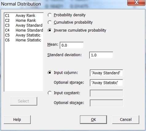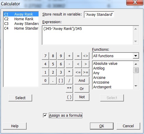 Let’s apply this to our model and see if it improves. To do this, we can first use Minitab’s calculator to standardize the rankings. The Pomery Ratings rank 345 basketball teams, so for each team we take 345, subtract their rank, then divide by 345.