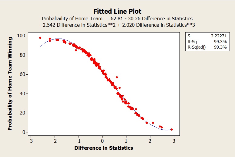 So we’re done right? Well, not quite. Look at the ends of the fitted line, especially the top left corner. You see how it starts to curve back down? This means that the better the team, the higher the statistic. So a negative value in the difference means that the home team is ranked higher than the away team. As this difference increases, the advantage the home team has over the away team should increase, too. But right around a difference of -2, our model starts to decrease. In other words, the better the home team, the less likely they are to win.
