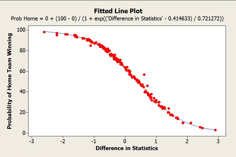 So I’ll select logistic growth, enter the “difference in statistics” as my predictor and the “probability of the home team winning” as the response. If you look at the picture, you’ll see that Theta 1 is the bottom asymptote, and Theta 2 is the top asymptote. We know those values are 0 and 100 because a team’s probability has to be between 0 and 100. Minitab can lock those values in place, so that’s just what we’ll have it do. We’ll start the other two parameters at 1 and let Minitab figure them out. So what do we get?
