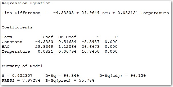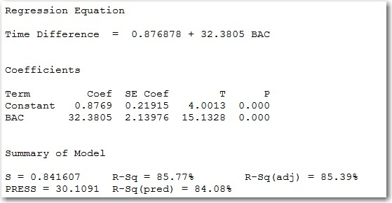 On a clear summer morning, I gathered 40 people who knew their 100-yard-dash time. Then I randomly assigned each person a varying amount of alcohol to drink. When they were done, I recorded their Blood Alcohol Content (BAC) and made them run a 100-yard dash. I recorded the difference between the time they ran intoxicated and their regular 100-yard-dash time (Time Difference).  Here are the regression results.