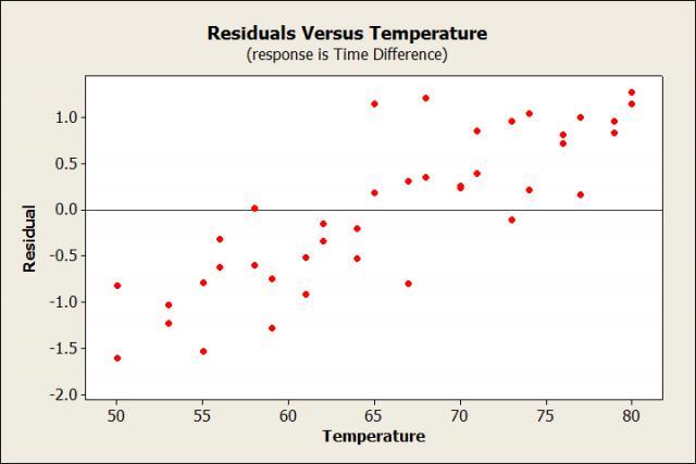 The data should be randomly spread around 0. But wait, this plot doesn't look random at all!  Oops, I think I realized what happened. Remember when I said I did the experiment on a clear summer morning? Well, it took awhile to get through all 40 people, so that morning turned into a hot summer afternoon, which then turned into a cool summer evening. Runners that went early or late in the day didn't have to deal with the heat, so their times were faster than expected (negative residual) based on the model. The runners in the middle had to run in the heat, so their times were slower than expected (positive residual). We can plot the residuals versus the variable temperature to test this theory.