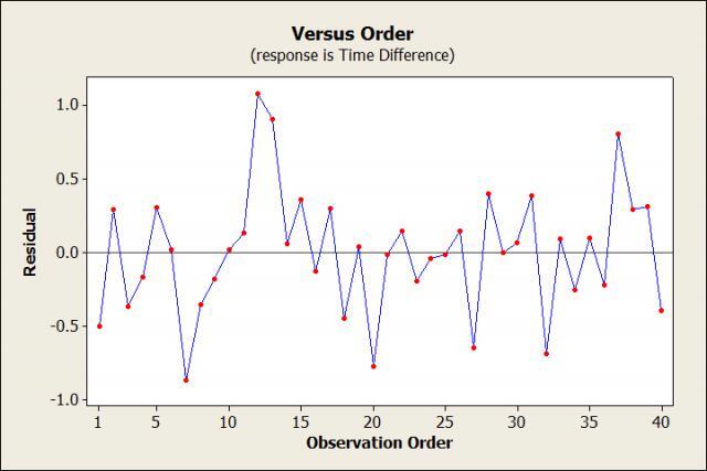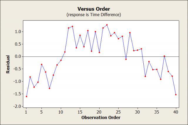 The p-value for BAC is less than 0.05 and our R-Squared value is 85.77%. I'd say we have a pretty good regression model! Of course, we're not done yet. There are assumptions to check! I recorded each runner one at a time and entered their data into Minitab in the order they were tested. So I should make a Residuals vs. Order plot to make sure the order of the runners didn't affect the results.