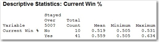 We see that the last 3 years, 51 teams have had a winning percentage over 0.500 on July 20th. The 39 observations with missing values are the teams that were below or equal to 0.500. So of those 51 teams, only 10 were not able to finish the season with a winning record. Of course, the 2011 Pirates were one of those teams. I blame Jerry Meals. But the 2012 Pirates have a winning percentage of 0.560. Have any teams with a winning percentage that high finished below 0.500?