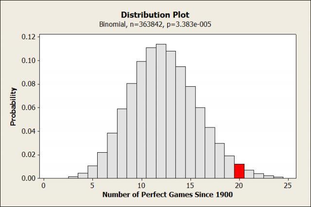 - 0.00003383 * 363,842 = We would have expected 12.3 perfect games since 1900