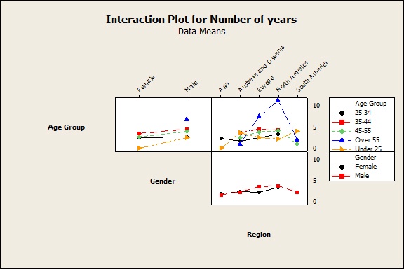 First, I wanted to know what types of people were at the cutting edge of this new and exciting technology.  I created an interaction plot of the age, gender, and region, which I then compared with the number of years the respondents had been using 3D printing technology by choosing Stat > ANOVA > Interactions Plot.