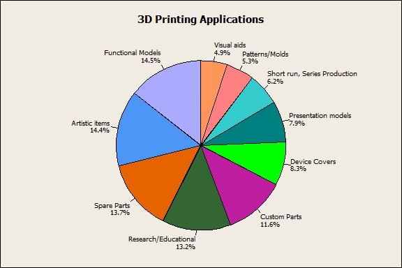 As 3D printing machines become more ubiquitous, there is a good chance we will see the data used in this Pie Chart slowly shift to reflect more common applications and long-run production schedules. Who knows, maybe someday we will each have a 3D printer in our house. No need to order online, let alone run to the store...just print your order instantly!