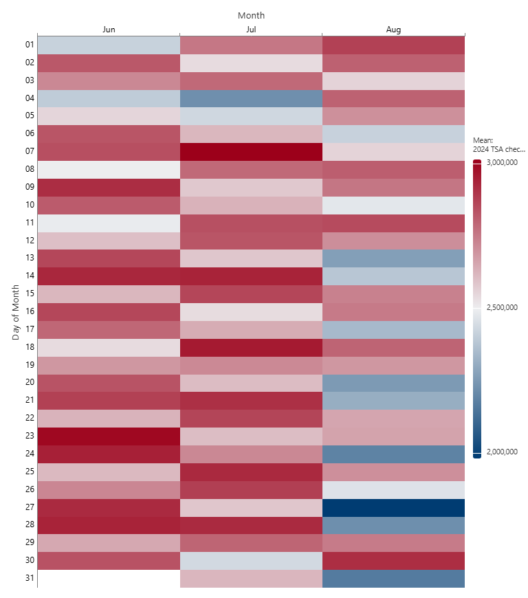 Heat map designed in Minitab Solution Center, using 2024 data from TSA's website.