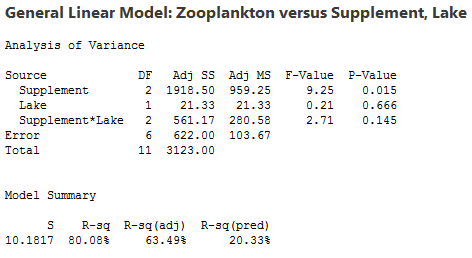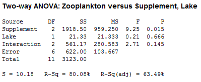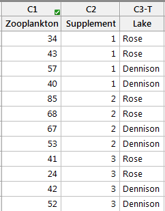 The data shown below is a sample dataset used for 2-Way ANOVA in Minitab 16: You as a biologist are studying how zooplankton live in two lakes. You set up twelve tanks in your laboratory, six each with water from one of the two lakes. You add one of three nutrient supplements to each tank and after 30 days you count the zooplankton in a unit volume of water. You use two-way ANOVA to test whether there is significant evidence of interactions and main effects.