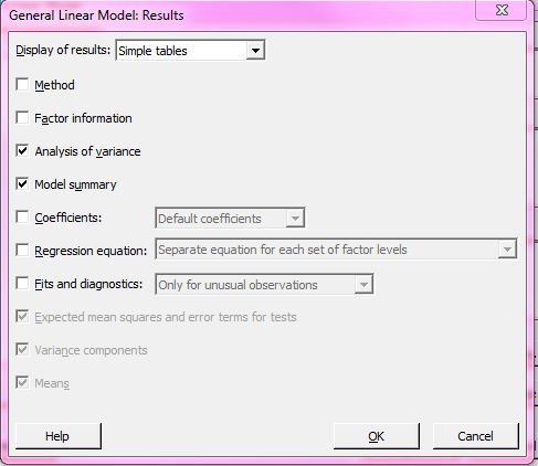 By default, Minitab 17 will provide more detailed output than Two-Way ANOVA in Minitab 16. To make the results match, we can remove the additional output by clicking the Results button within the GLM dialog box. Unchecking the additional options so that only Analysis of variance and Model summary are selected (as shown below) will make the output match Minitab 16’s Two-Way ANOVA results.