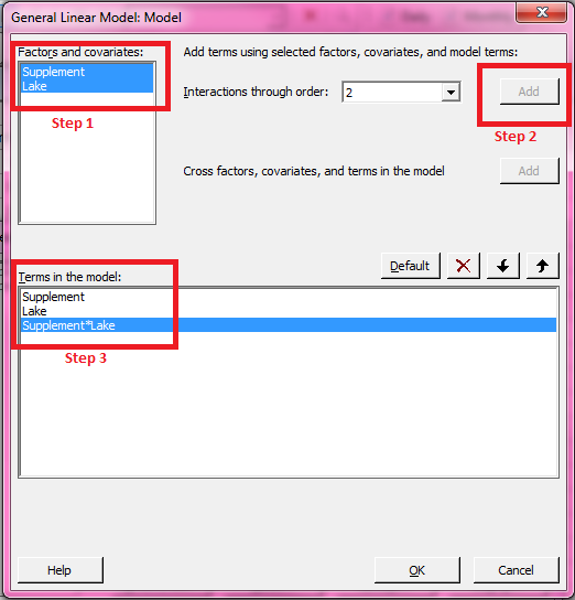 Minitab 16's Two-Way ANOVA option also shows the two-factor interaction, so in Minitab 17 we need to manually add the interaction by clicking the Model button in the GLM dialog box. There we can highlight the factors listed on the left side (step 1 below); when we do that, the Add button on the right will become available. To add the interaction, click Add (step 2) and the interaction will be shown at the bottom under Terms in the model (step 3).