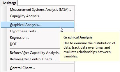 Since it’s always a good idea to visualize your data, you select Assistant > Graphical Analysis.