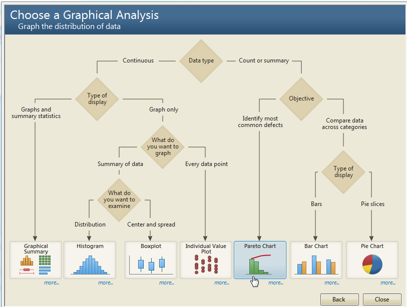 You want to know what types of medication errors are the most frequent. The Assistant's decision tree will guide you to the right option. Since you want to see the defect types for the count data you’ve collected, the Assistant directs you to the Pareto Chart.