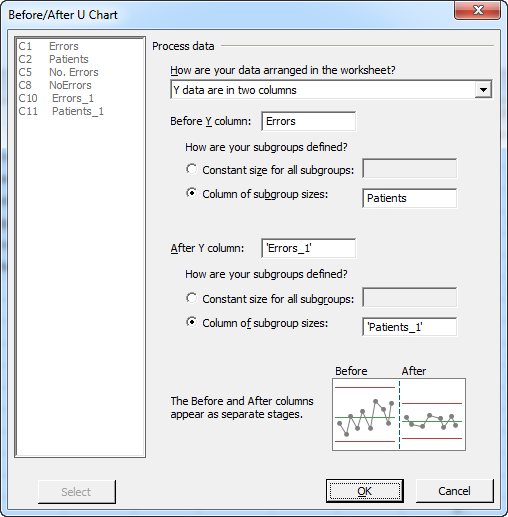 Because you have attribute data, and since each patient could be associated with more than one medication error, the Assistant's decision tree guides you to the U Chart. Complete the dialog box as shown: