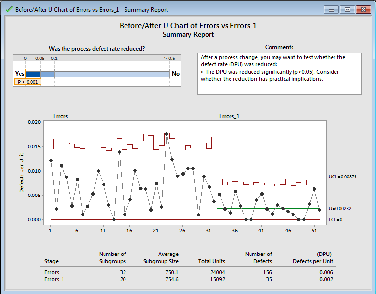 Your before/after control chart shows that the changes have had a significant impact on the amount of medication errors. The chart also shows that the new process is stable and in statistical control.