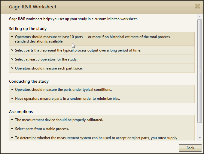 If you're not sure about what you need to do in a gage R&R, clicking the more... link gives you requirements, assumptions, and guidelines to follow: