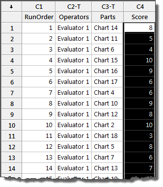 To get data, three evaluators used the tool to assess each of 20 charts three times each, and recorded their score for each chart in the worksheet we produced earlier. (You can download the completed worksheet here if you're following along in Minitab.)