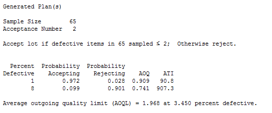 When incoming lots are very good or very bad, the outgoing quality will be good because poor lots get reinspected and fixed, and good lots are already good. In the graph below, the AOQ level is 1.4% at the AQL and 1.0% at the RQL. But when incoming quality is neither very good or very bad, the number of bad parts that gets through rises, so outgoing quality gets worse. The maximum % defective level for outgoing quality is called the Average Outgoing Quality Limit (AOQL). This figure is included in the session window output above, and you can see it in the graph below: At about 3.45% defective, Average Outgoing Quality Limit(AOQL) = 1.968, the worst-case outgoing quality level.