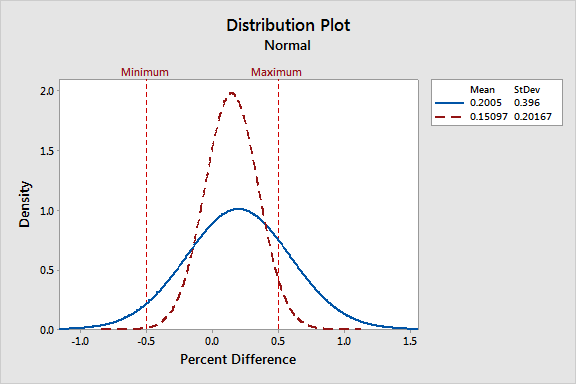 But if we go in Minitab to Graph > Probability Distribution Plot, select the "View Probability" option, and enter the information about these distributions, the impact of the change will be revealed.