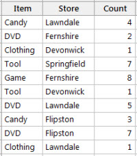When the data appear in this uncontrolled order, finding an observation for any particular item, or from any specific store, would entail reviewing the entire list. We can fix that problem by selecting Data > Sort... and reordering the data by either store or item.