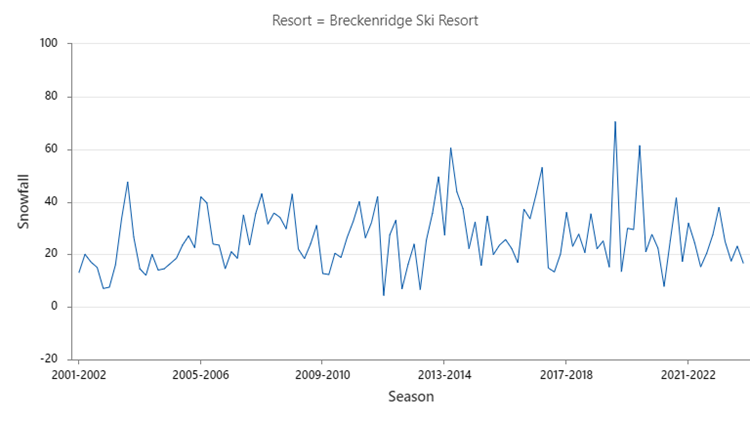 También elaboramos gráficas de series temporales de nevada total por mes (diciembre a abril) para cada estación. Esto nos permitió ver cómo las cantidades de nieve han cambiado con el tiempo debido a los patrones climáticos, el cambio climático y variaciones menores de una estación a otra. También nos permite ver cuánta nieve ha caído en los últimos años. Aquí están los resultados para Breckenridge: