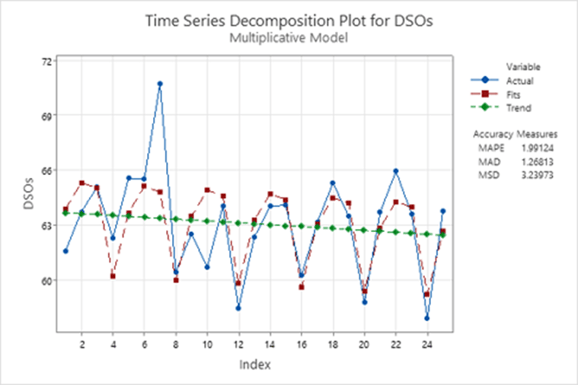 Utilizando Minitab Statistical Software, pude tomar exactamente el mismo conjunto de datos y ejecutar un análisis de series de tiempo (con el comando Descomposición para dar cuenta de la estacionalidad trimestral). Al hacerlo, obtuve dos perspectivas excelentes: primero, la gráfica de descomposición de series de tiempo destacó una tendencia de que se estaba mejorando el DSO. Es posible que el equipo de finanzas haya estado implementando proactivamente procesos para cobrar más rápido o haya tenido suerte. De cualquier manera, la tendencia muestra una disminución del DSO, que es positiva.