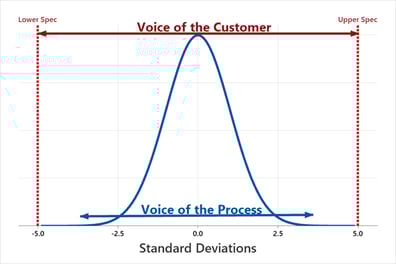 Podemos medir fácilmente la “voz del cliente”; es decir, la tolerancia aceptable o la distancia entre los límites de especificación. La medición de la “voz del proceso” es un poco más complicada y suele hacerse suponiendo que las mediciones provienen de una población con forma de curva en perfil de campana. Esto tiene la conveniente propiedad de tener aproximadamente seis desviaciones estándar de ancho, lo que hace que la “voz del proceso” sea aproximadamente seis veces la desviación estándar.
