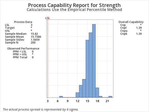 Para los datos de los tubos médicos, se puede ver que incluso con esa situación normal de dos valores atípicos, el proceso aún era capaz de cumplir con su límite de especificación inferior. Puede interpretar el estadístico de capacidad no paramétrico, Cnpk, como lo haría con otras estadísticas de capacidad, como Cpk y Ppk. En este caso, Cnpk = 1.39, lo que superó el objetivo de capacidad de la empresa de 1.33.