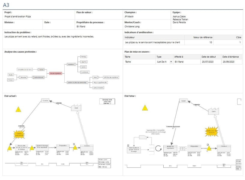 Grâce à Minitab Engage, il est possible de visualiser sur un seul et même écran le procédé de fabrication d'une pizza. Un formulaire A3 vous permet également de joindre un diagramme de brainstorming pour mieux comprendre la cause profonde d'un problème, ce qui vous confère une meilleure vue d'ensemble de votre procédé.