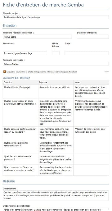 Notre exemple de fiche d'entretien Gemba Walk présente un procédé de fabrication qui fait appel à Minitab Engage. Elle offre une vue d'ensemble du projet, des observations et des possibilités d'amélioration.
