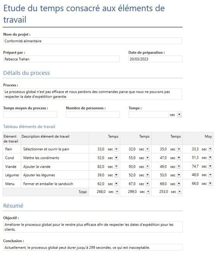 Etude du temps consacré aux éléments de travail est un outil utilisé pour analyser et améliorer un procédé. Il consiste à prendre une tâche, à la segmenter en plusieurs étapes et à mesurer le temps nécessaire à la réalisation de chacune d'entre elles. Les données recueillies et analysées au cours du procédé permettent de déceler les inefficacités, de stimuler la productivité et d'éliminer les gaspillages.