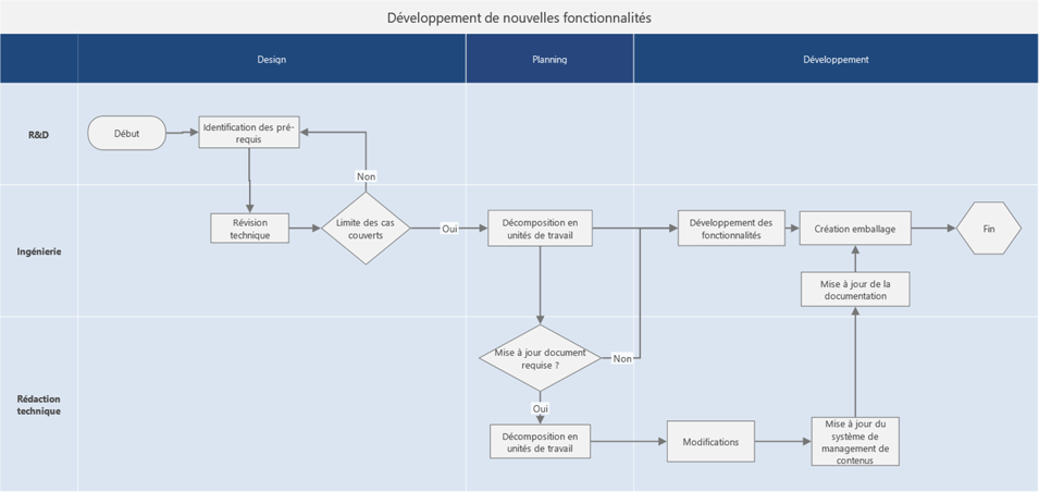 Une cartographie de procédé, parfois appelée diagramme de flux, représente visuellement l'ensemble des étapes et des activités d'un procédé ou d'un workflow. Elle permet de modéliser votre procédé, de comprendre et de communiquer le lien entre les entrées et les sorties, ainsi que d'identifier les points de décision clés et les boucles de reprise.